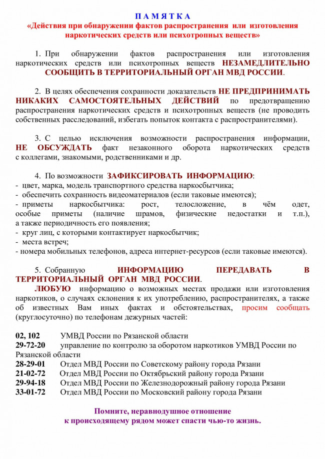 П А М Я Т К А «Действия при обнаружении фактов распространения или изготовления наркотических средств или психотропных веществ»